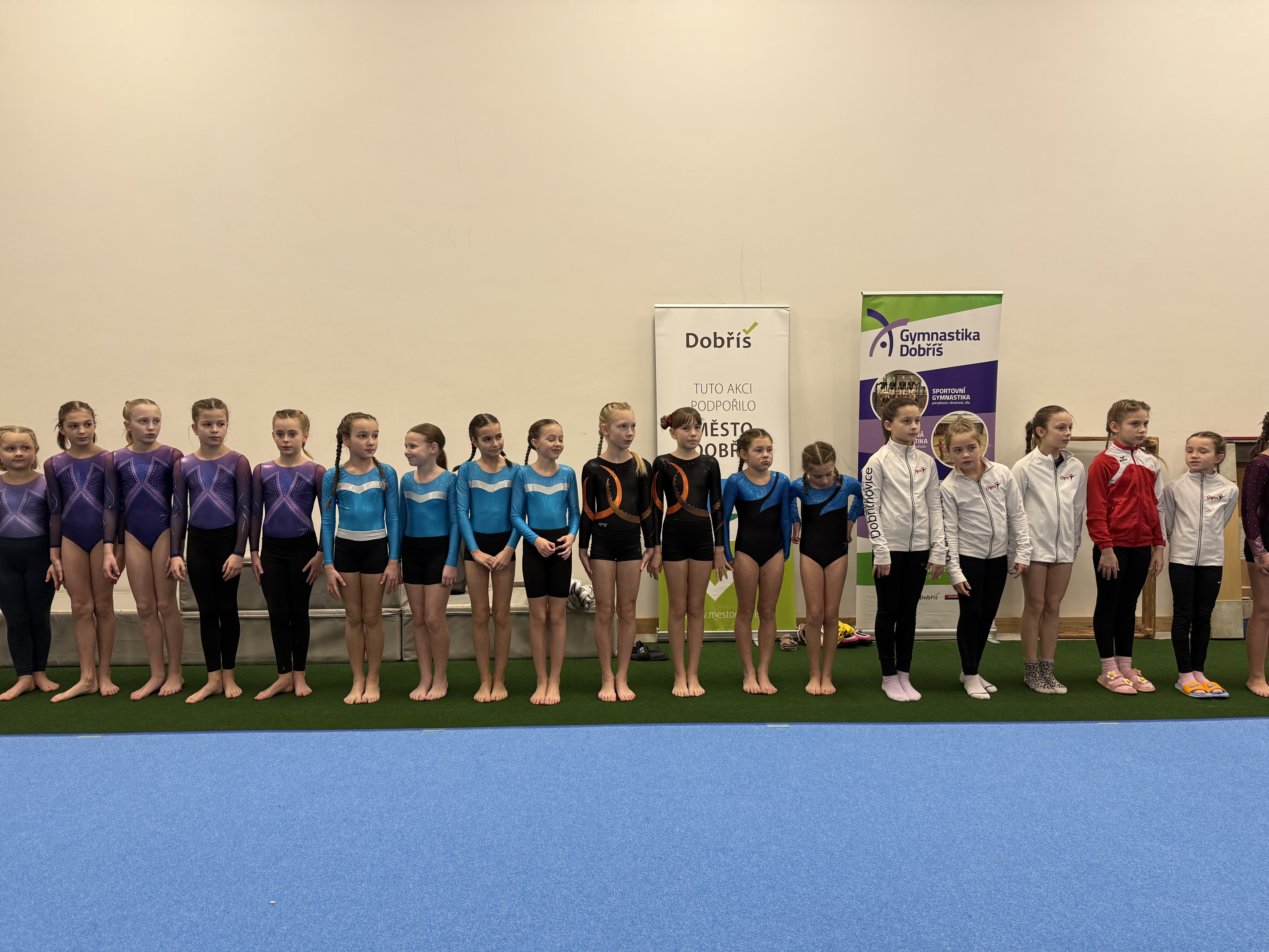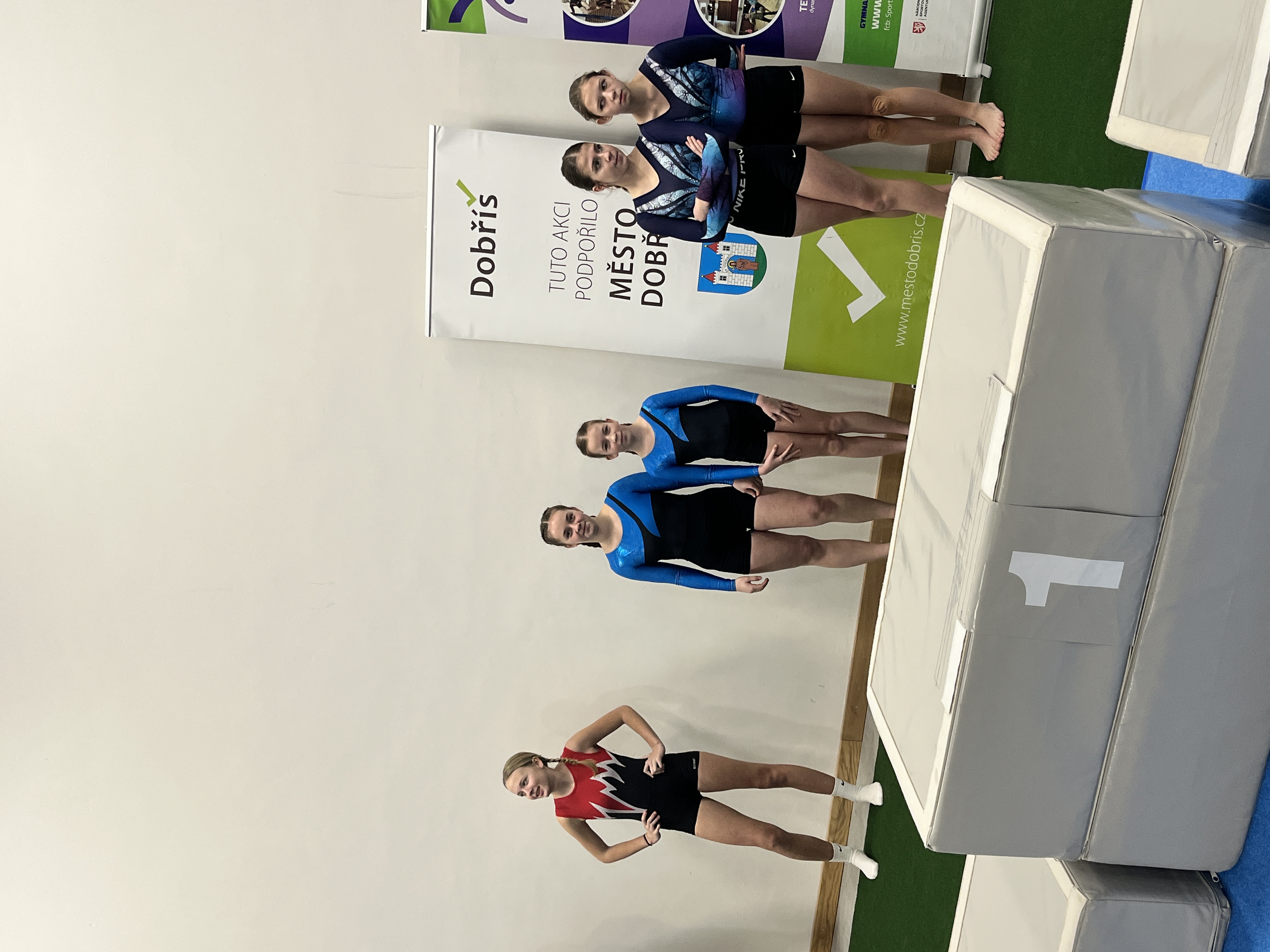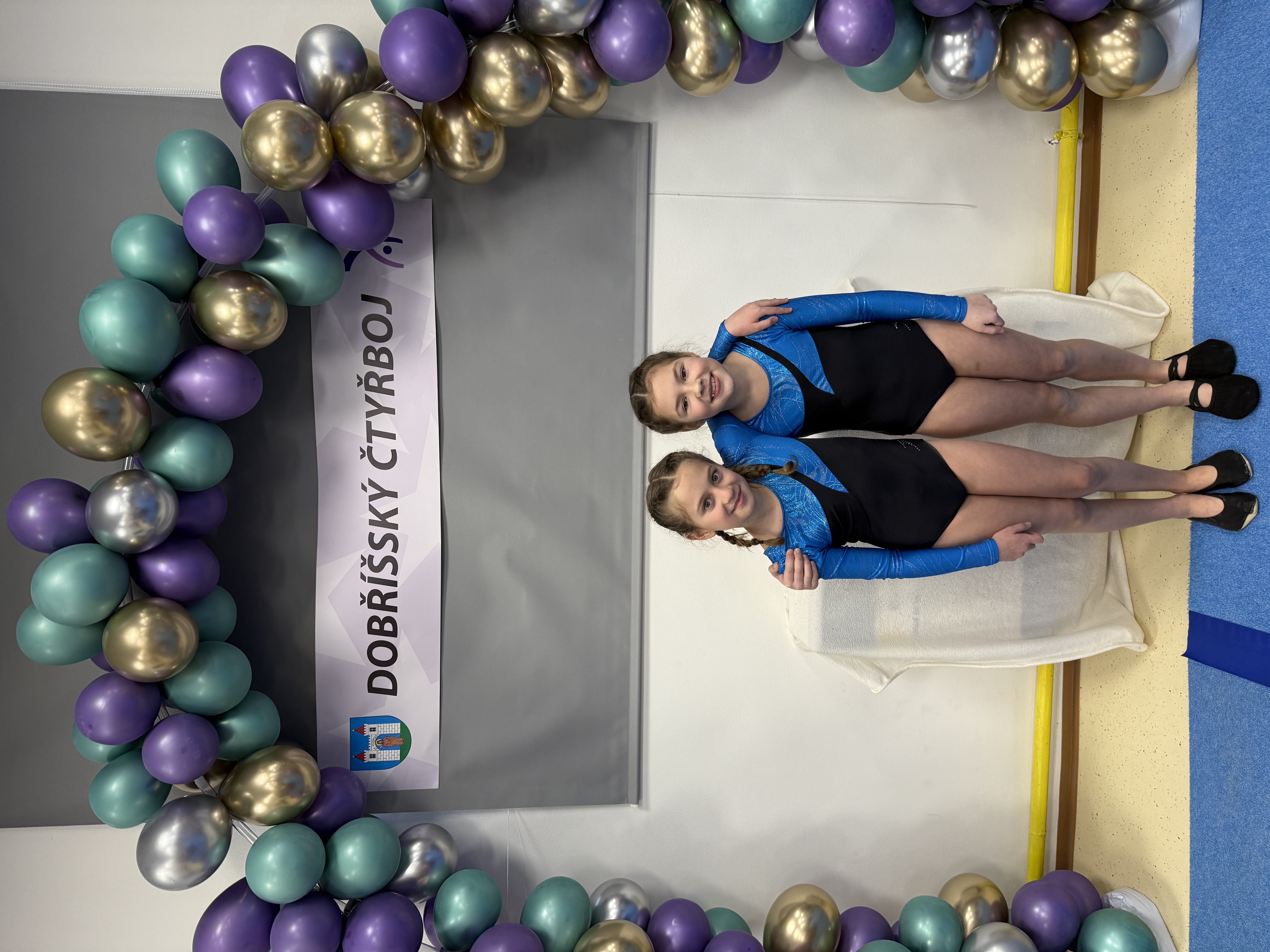 V sobotu 17. ledna 2026 se v Dobříši konaly gymnastické závody ve čtyřboji – akrobacie, kladina, přeskok a hrazda. Závodilo se netradičně ve dvojicích, přičemž každá gymnastka nastoupila na dvou nářadích. Z našeho oddílu se zúčastnily čtyři dvojice a navíc dvě nejmladší závodnice – Eliška Vaňoučková a Gita Nedbalová, které tentokrát soutěžily samostatně v trojboji (bez hrazdy).