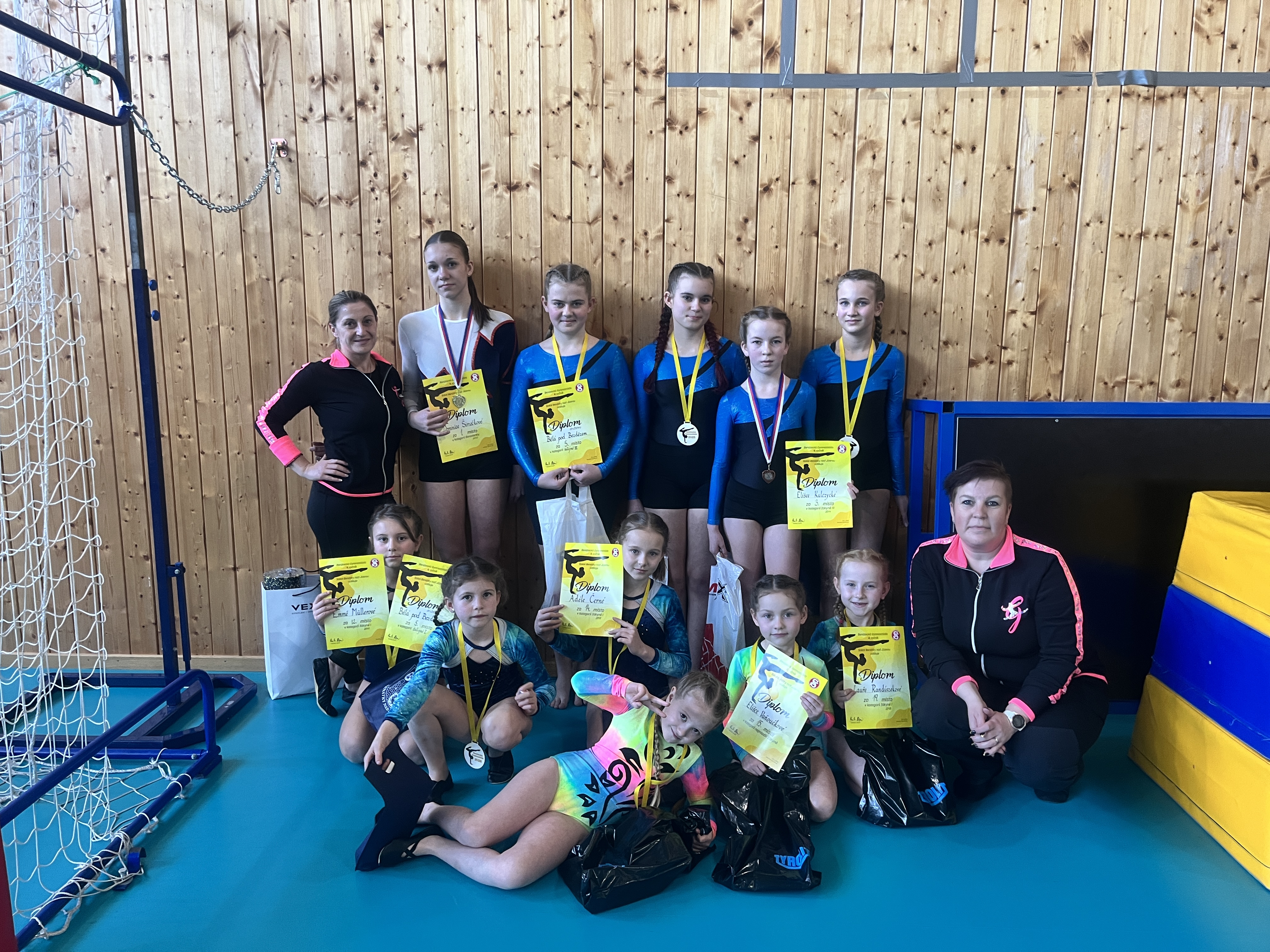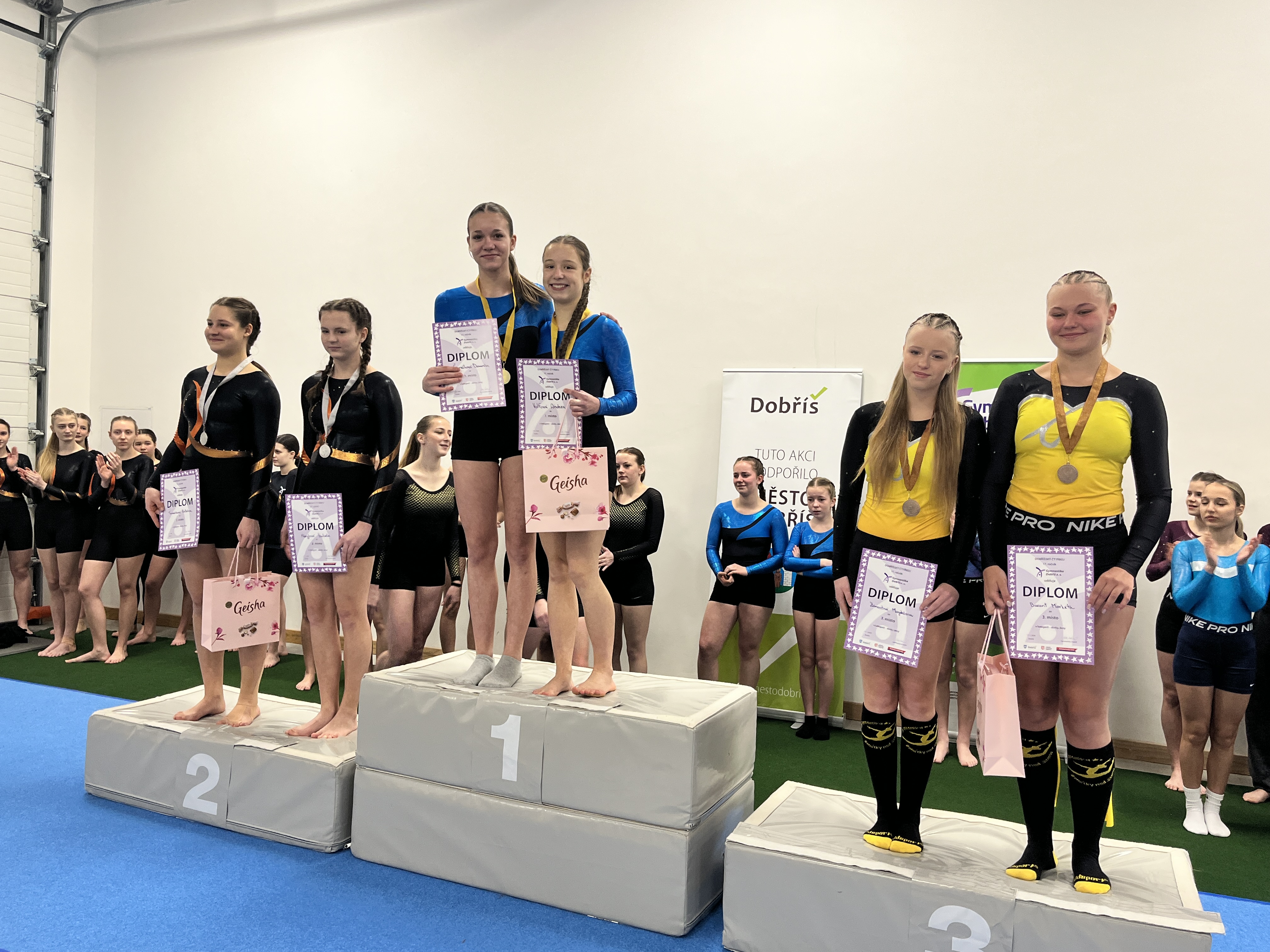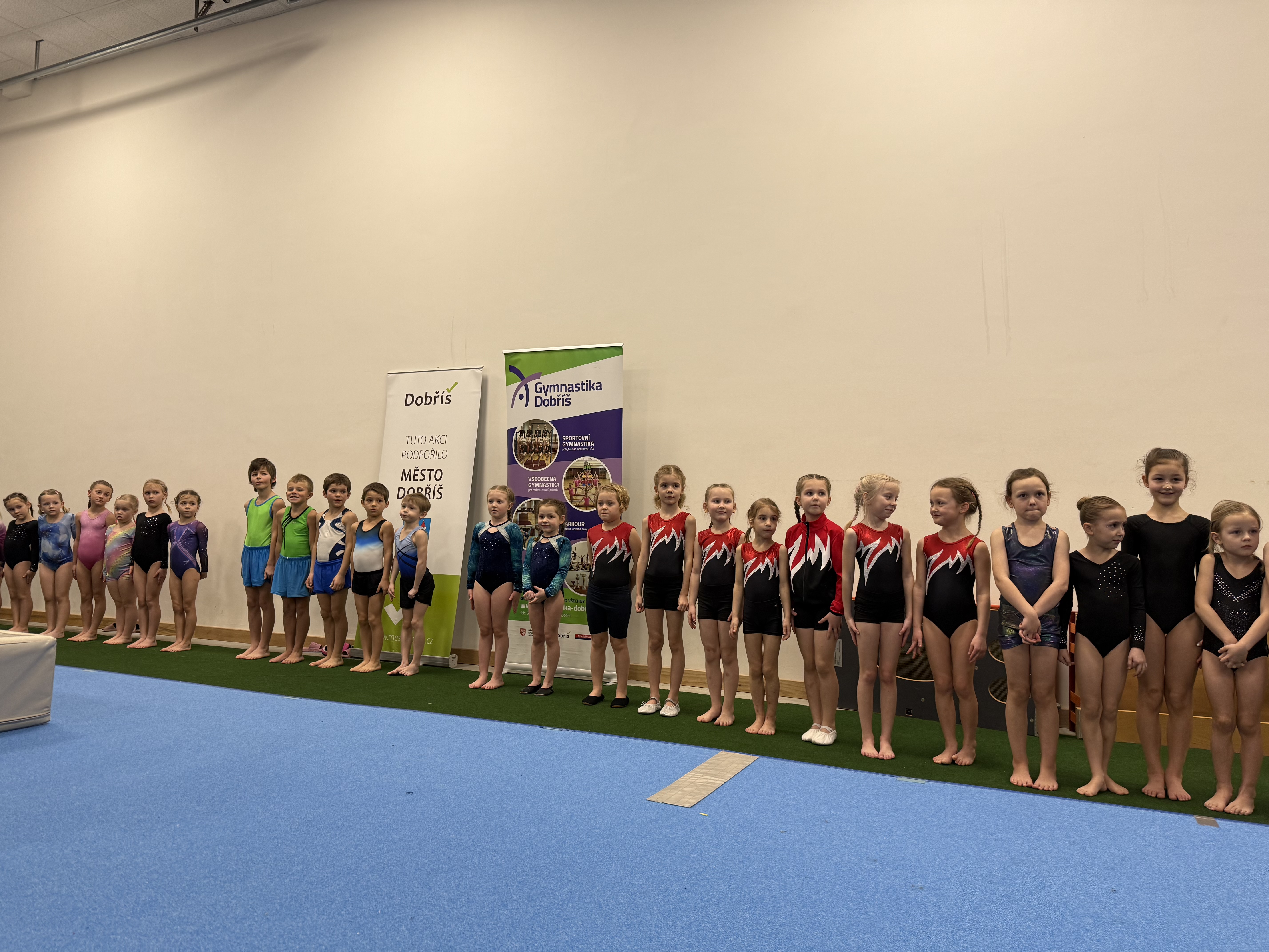 V sobotu 17. ledna 2026 se v Dobříši konaly gymnastické závody ve čtyřboji – akrobacie, kladina, přeskok a hrazda. Závodilo se netradičně ve dvojicích, přičemž každá gymnastka nastoupila na dvou nářadích. Z našeho oddílu se zúčastnily čtyři dvojice a navíc dvě nejmladší závodnice – Eliška Vaňoučková a Gita Nedbalová, které tentokrát soutěžily samostatně v trojboji (bez hrazdy).